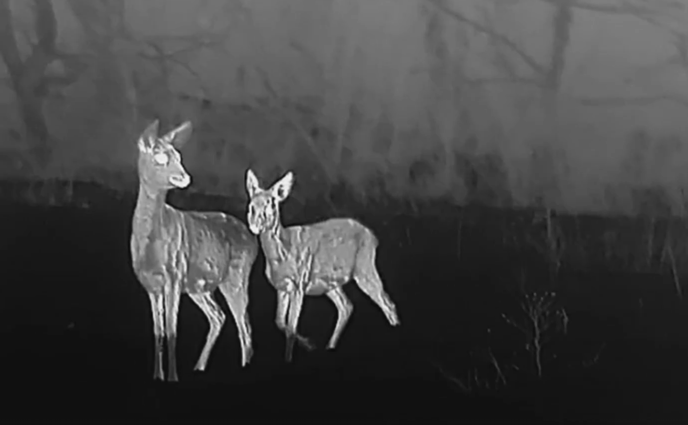 На видео группа косуль убегая от человека, потеряла своего подростка. Но затем вернулась за молоденькой косулей и уже все вместе они убежали в лес.